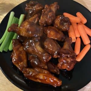 RICAS ALIAS DE POLLO BAÑADAS EN SALSA DE LA CASA, ACOMPAÑADAS CON VARITAS DE APIO, VARITAS DE ZANAHORIAS Y ADEREZO